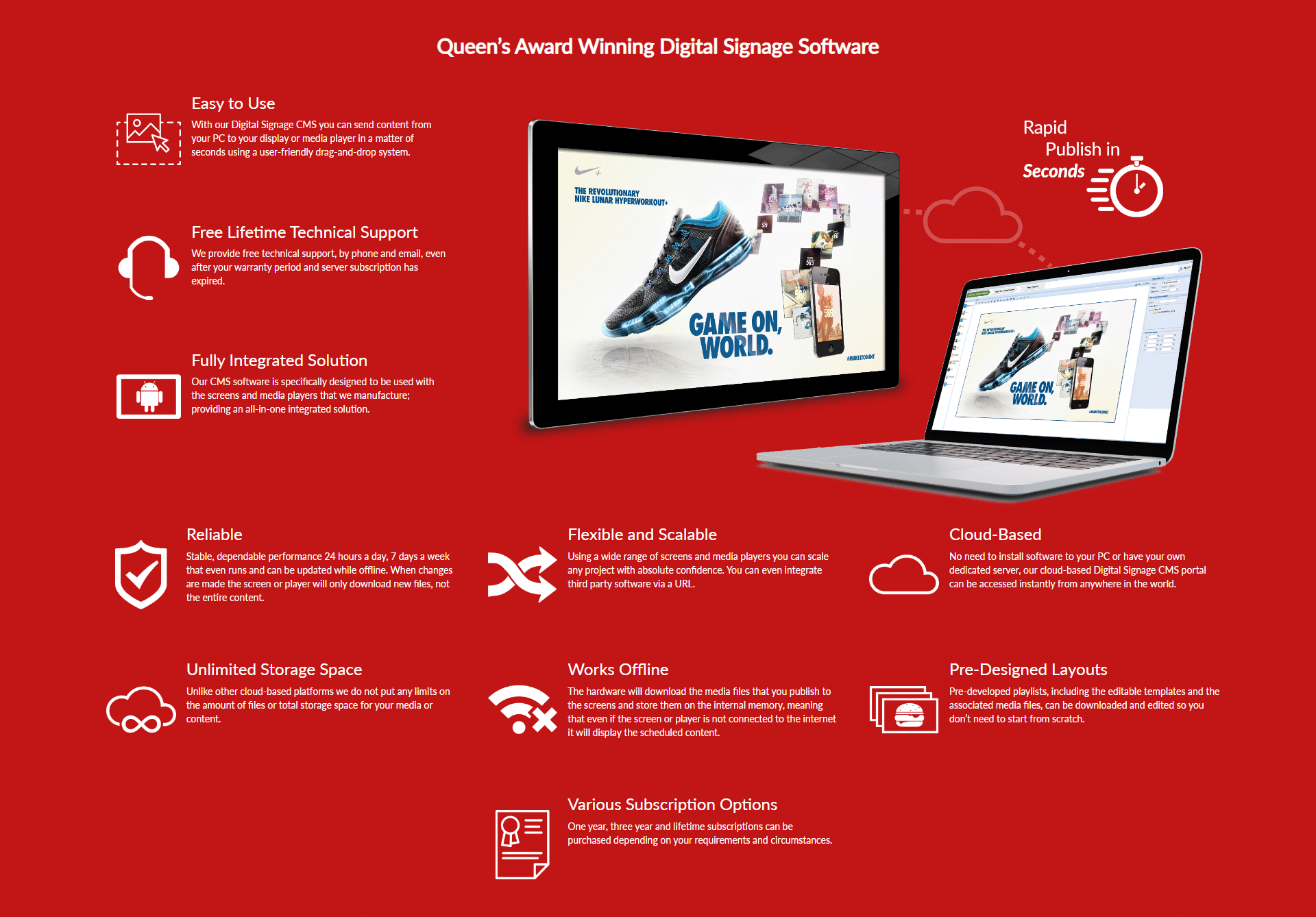 The Content Management System software is a fully integrated, all-in-one solution that is designed specifically to use with our screens and give a stable, dependable performance.